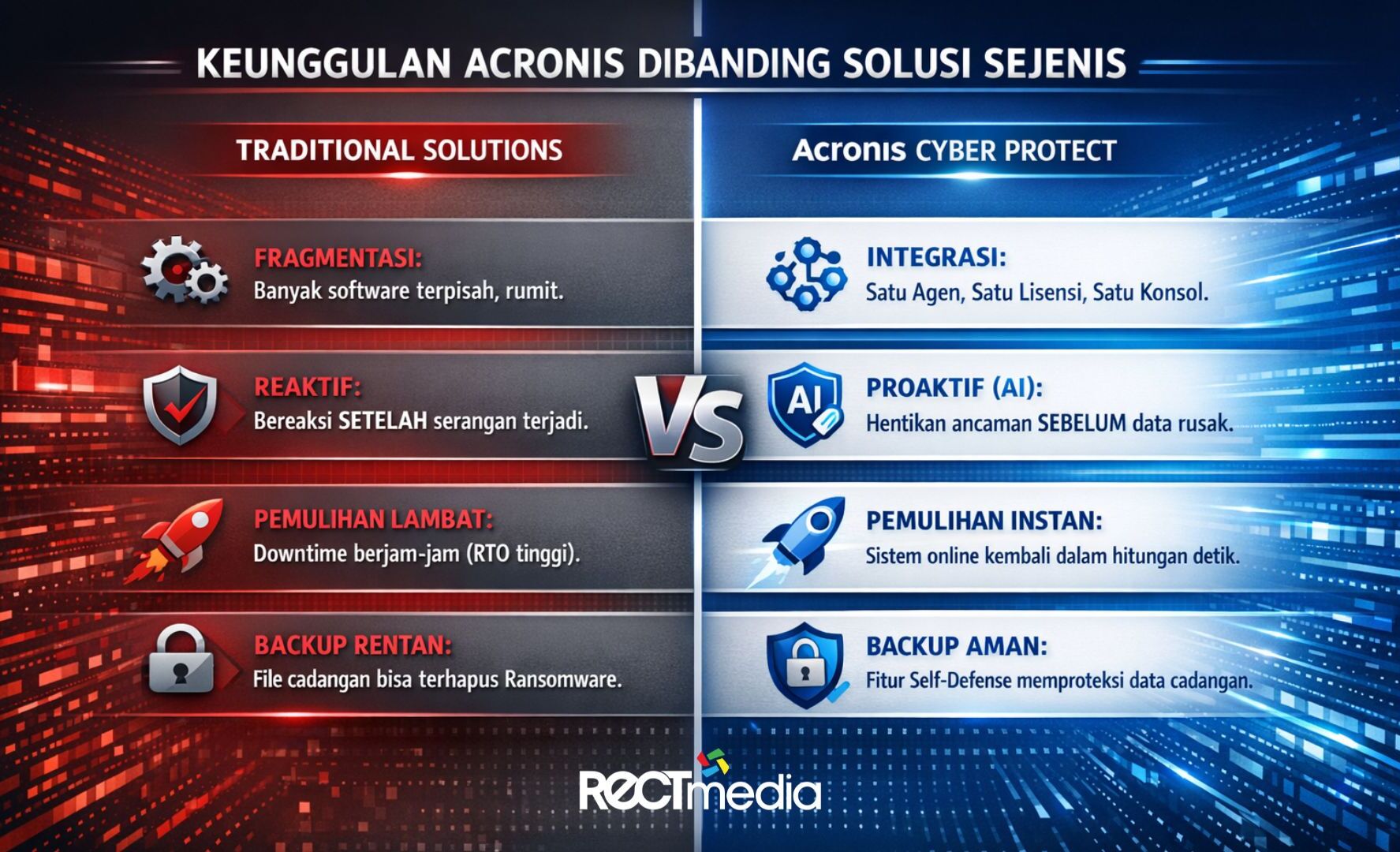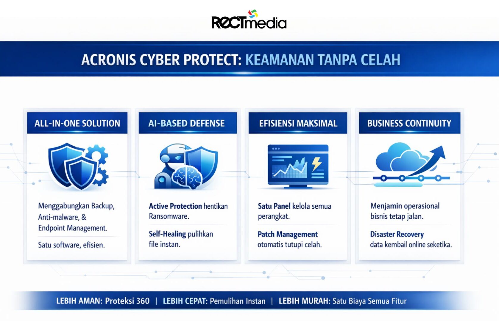 Dengan kombinasi fitur tersebut, Acronis tidak hanya berperan sebagai sistem proteksi, tetapi juga sebagai enabler produktivitas. Tim dapat tetap bekerja secara fleksibel dan kolaboratif tanpa harus mengorbankan aspek keamanan, sementara sistem tetap terlindungi dari potensi ancaman yang terus berkembang.